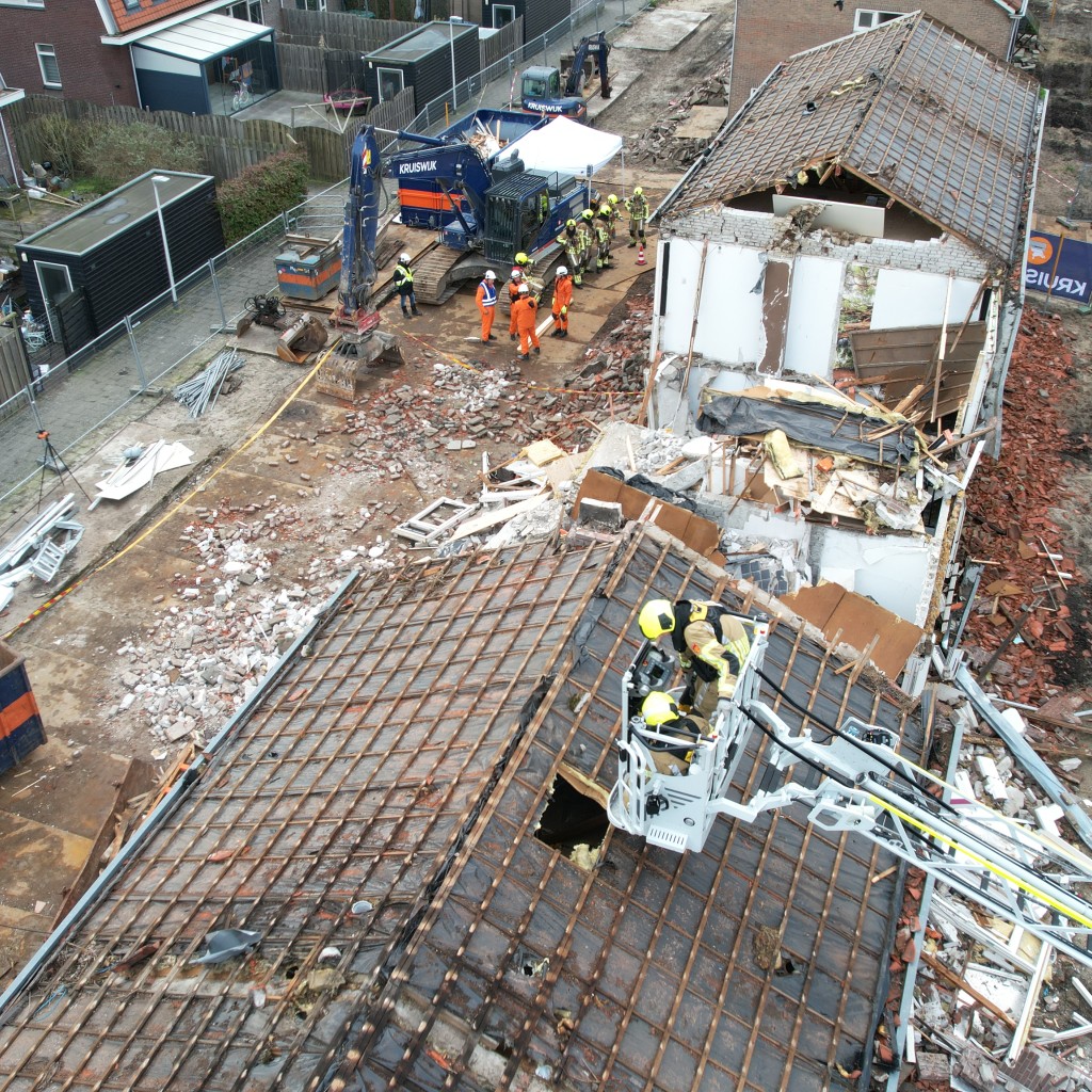 De woningen zijn vooraf door ons geschikt gemaakt voor de oefening. Het scenario bestond uit een explosie met instorting en brand, waarbij meerdere slachtoffers moesten worden opgespoord en gered. Er werd opgeschaald naar “zeer grote brand – GRIP 1”.
